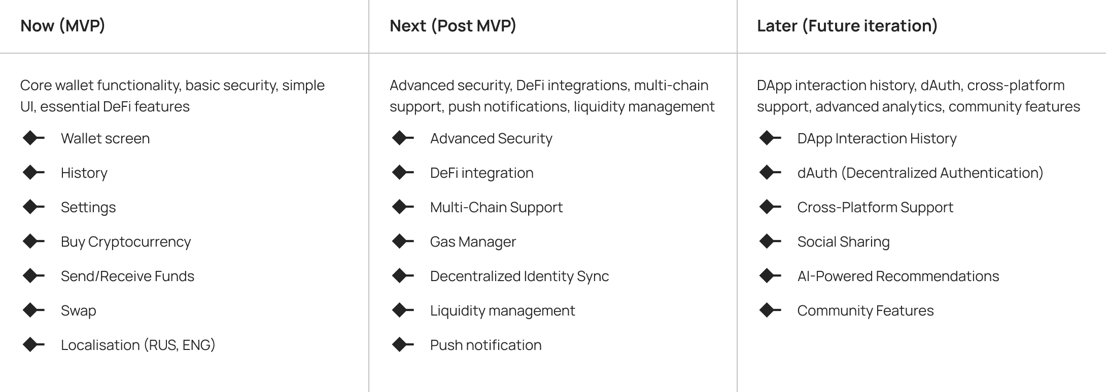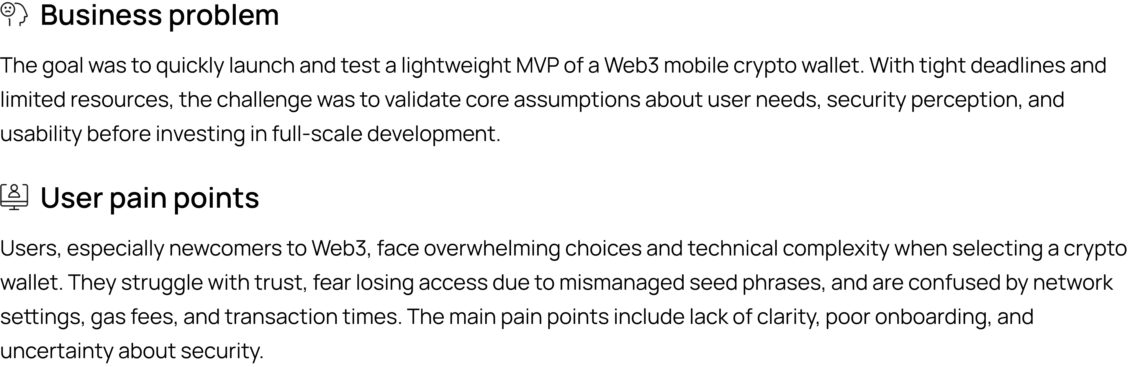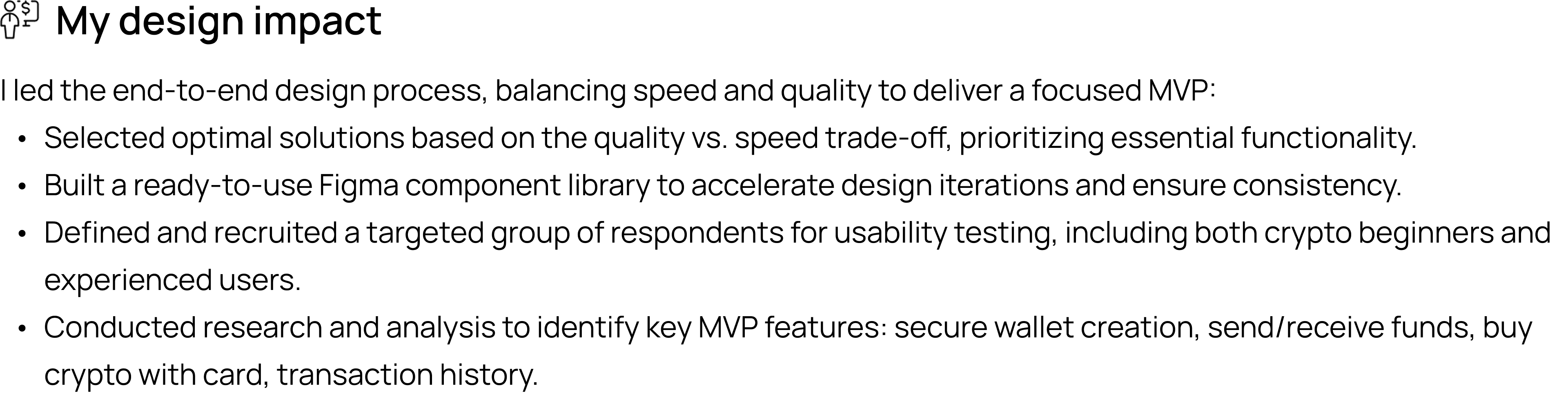 A user-centric mobile crypto wallet designed to simplify access to Web3. The app enables secure storage, sending, receiving, and buying of cryptocurrencies, with support for multiple chains, NFTs, and DApp connectivity. Built as a fast MVP, it focuses on intuitive onboarding, clear transaction flow, and user trust — making blockchain accessible for both beginners and experienced users.